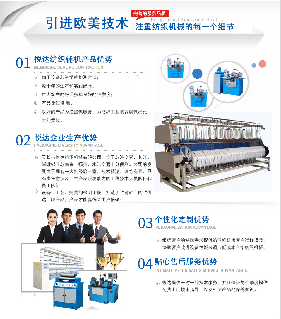 公司是主要生產(chǎn)紡織平車安裝工具、紡部輔件及配件綜合性企業(yè)。已有二十多年的生產(chǎn)歷史,在激烈的市場競爭中始終保持優(yōu)良的質量、優(yōu)化的價格、齊全的品種優(yōu)勢。產(chǎn)品暢銷全國各地,深受新老客戶的好評。